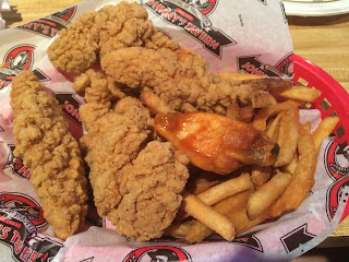 Now, there're two things you probably notice about the above picture. For one, there's a wild wing in there. That wing came from a Buffalo wing appetizer that everyone shared. For two, I'm sure you can tell that these strips aren't Buffalo style. We can't have that, now can we?!